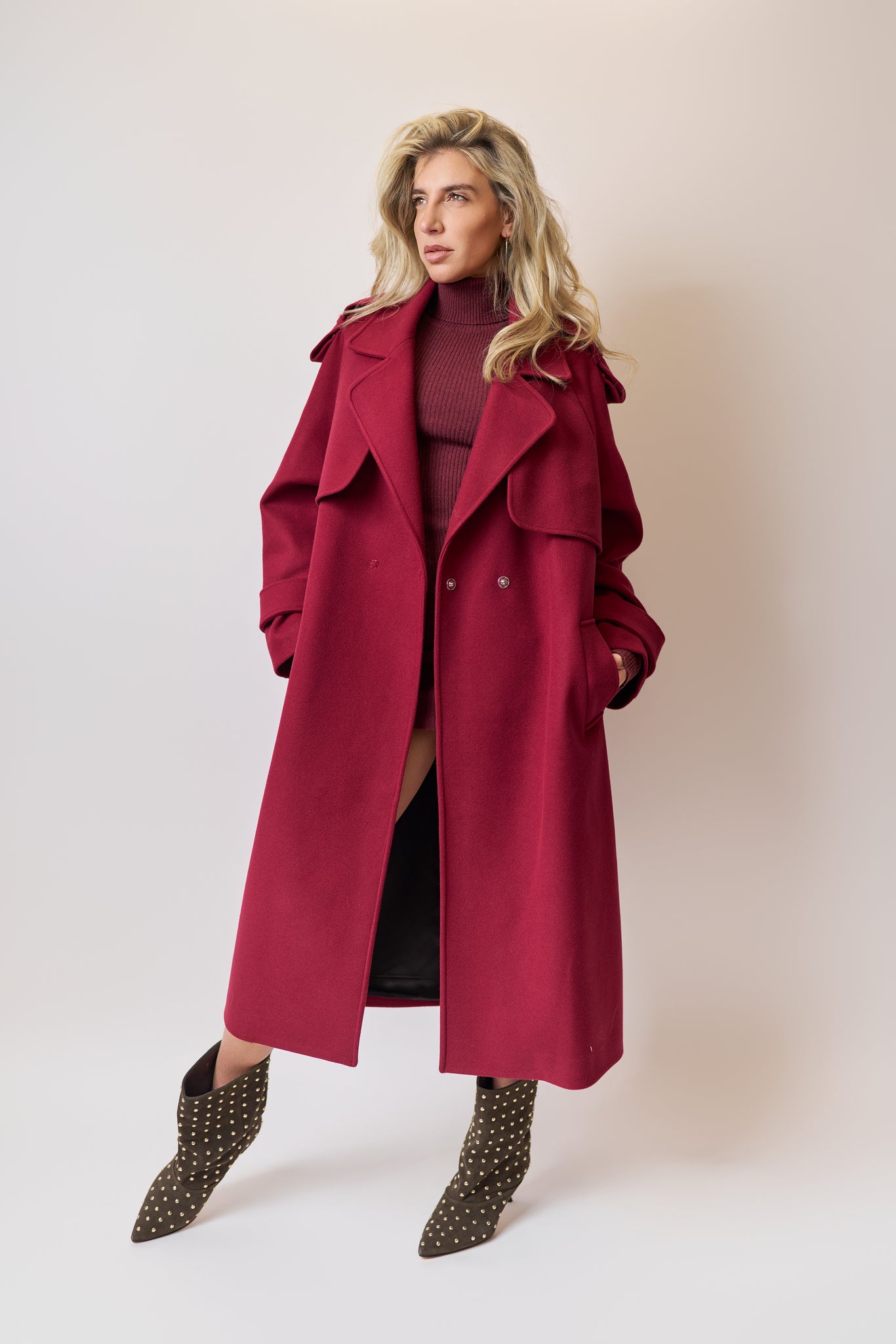 Cappotto doppiopetto con bottoni a pressione e dettagli in stile trench.