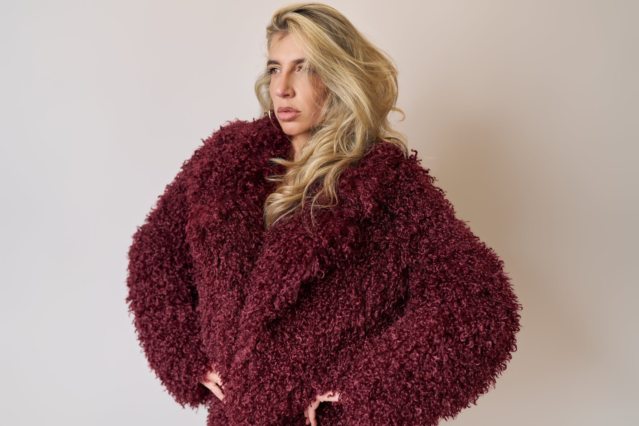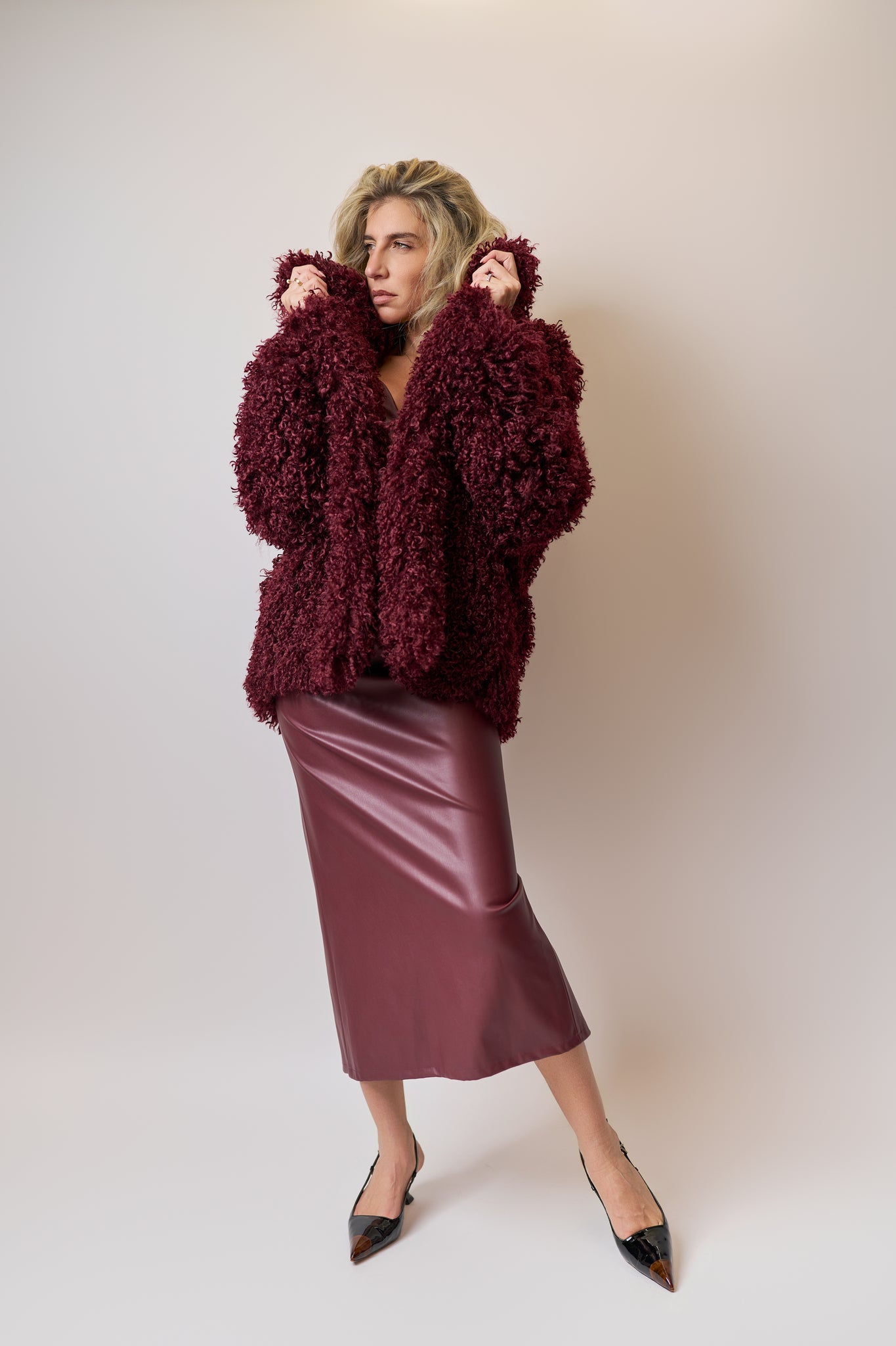 Cappotto in ecomongolia con chiusura a ganci nascosti e vestibilità comoda.