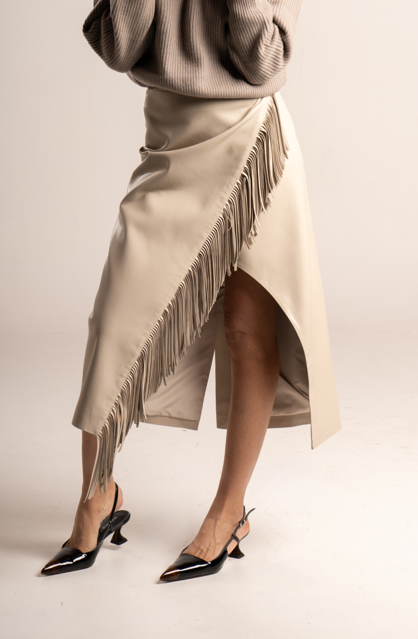 Gonna asimmetrica a portafoglio in ecopelle panna con frange laterali.