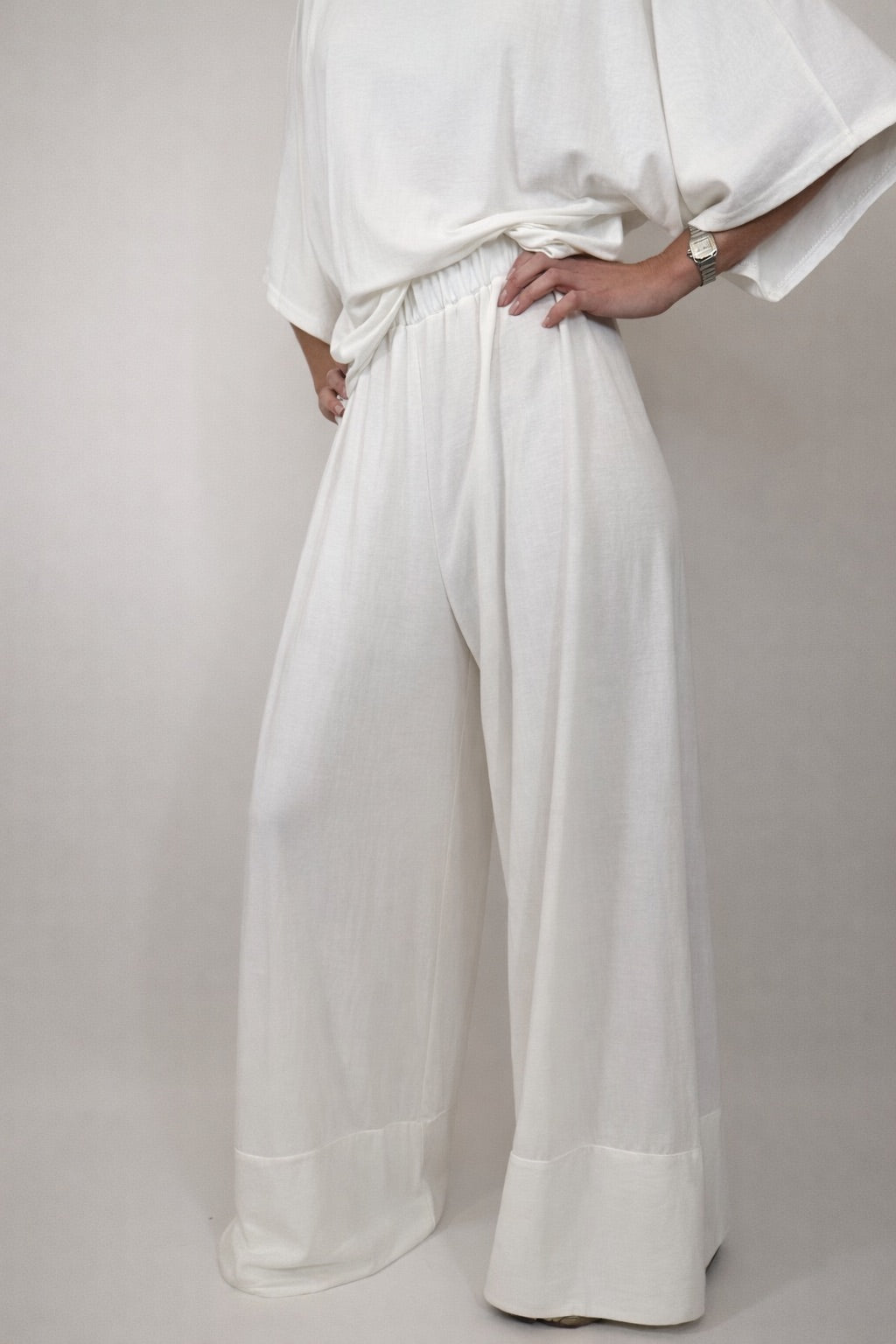 Pantalone palazzo in modal, con elastico in vita, vestibilità morbida.