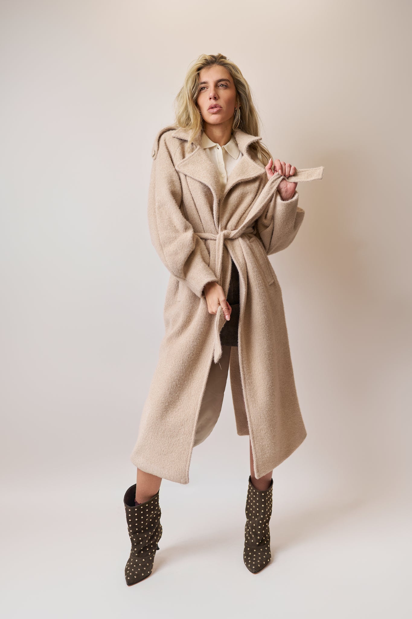 Cappotto doppio petto con bottoni a scomparsa, cintura in vita, dettagli sulle spalle tessuto super soffice peloso.