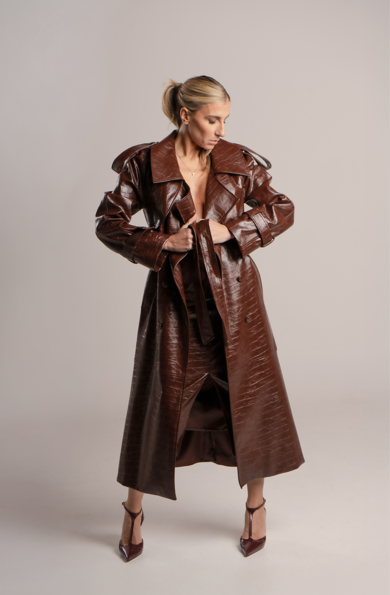 Trench doppio petto stampa cocco marrone con cintura e spacco sul retro.
