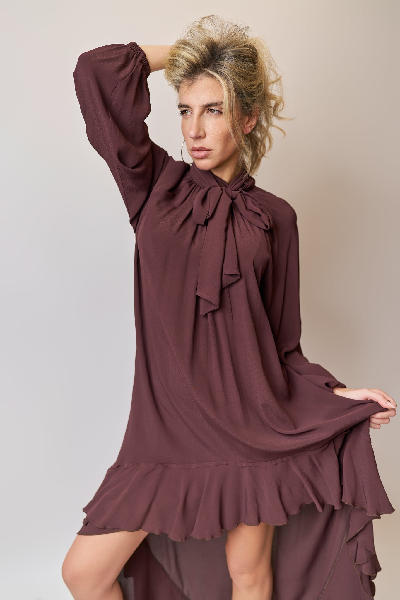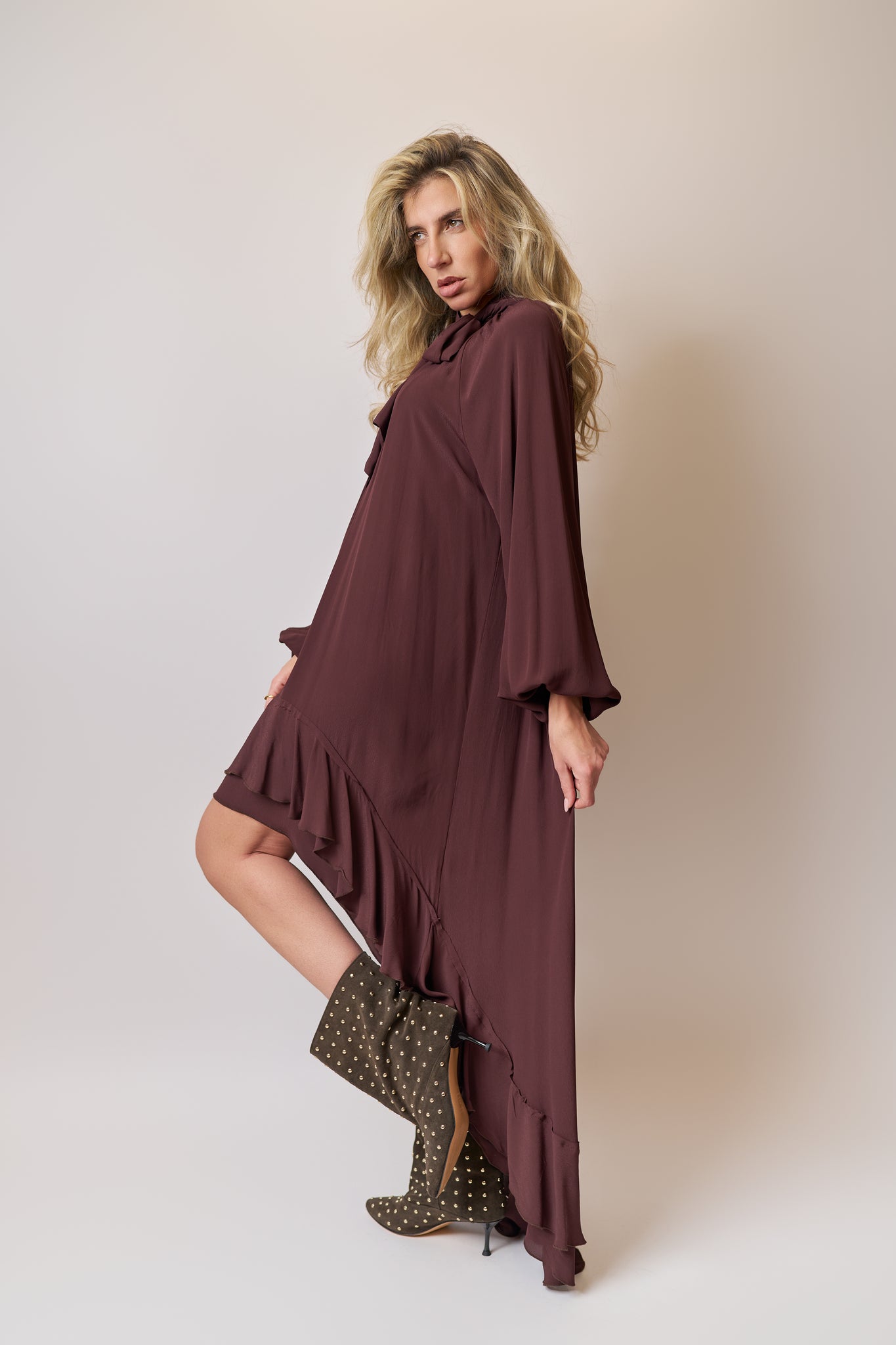 Abito asimmetrico in viscosa dalla linea morbida.