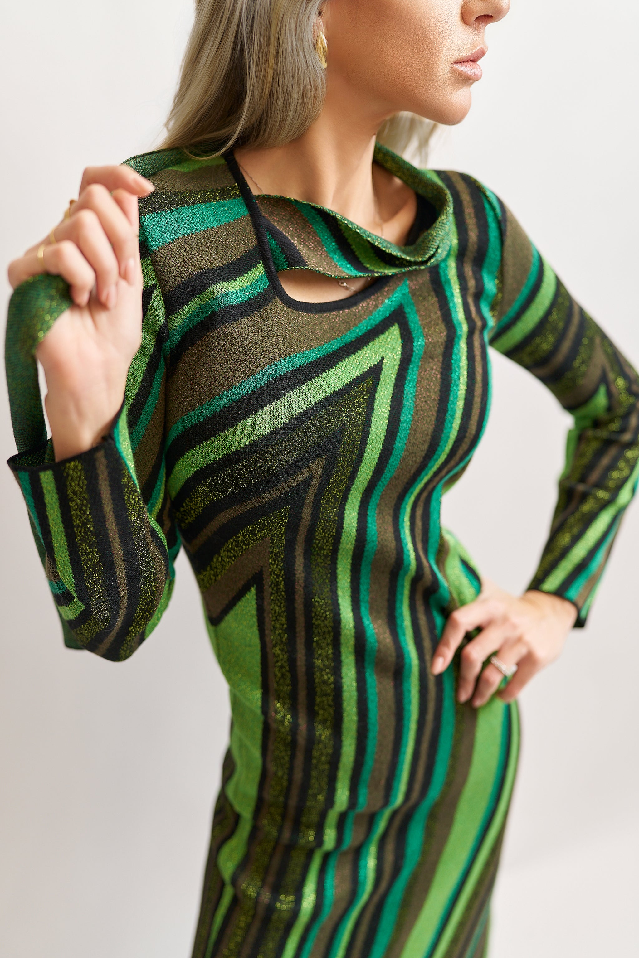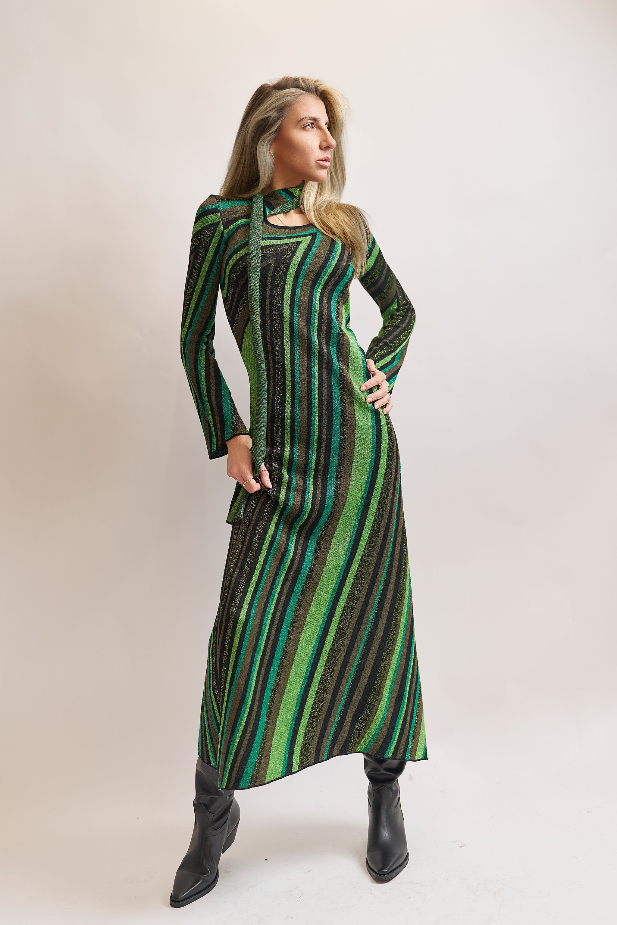 Abito lungo in viscosa e cotone con scollo a sciarpa e motivo a righe diagonali.