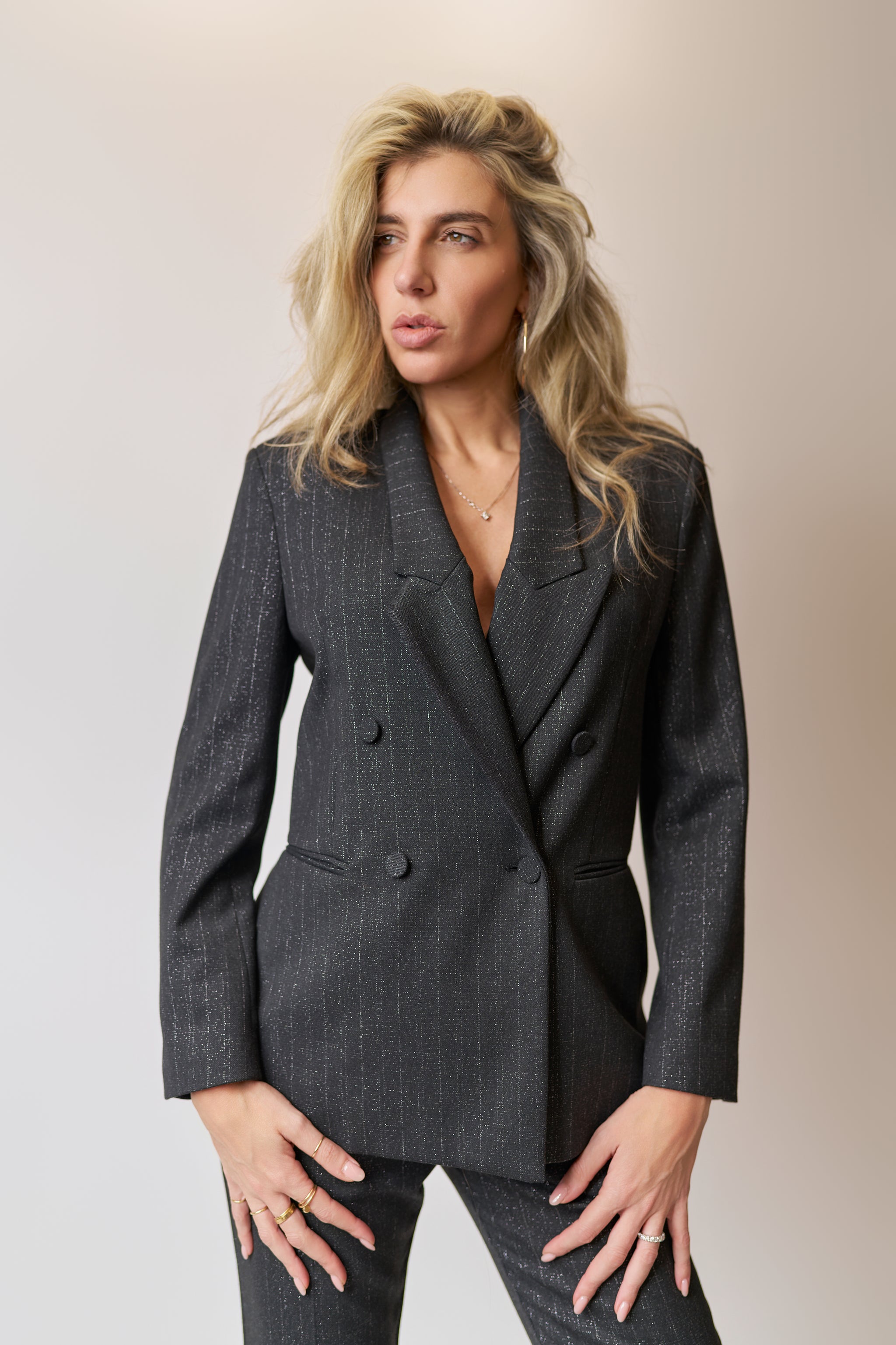 Blazer doppiopetto con filato lamé e colletto a revers.